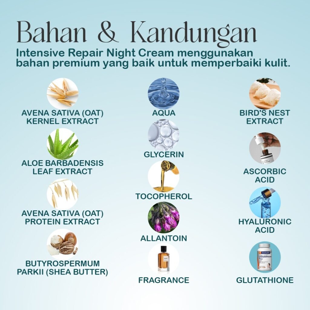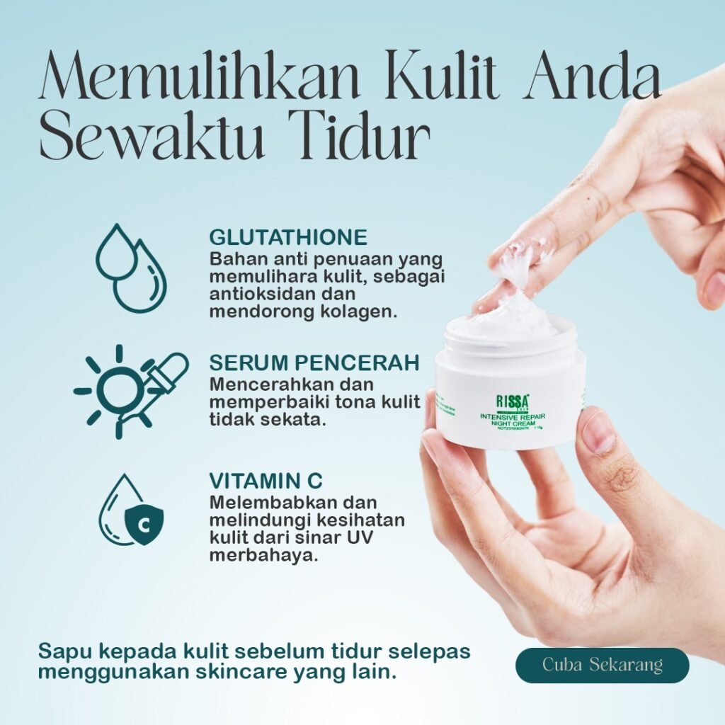 Rissa Skin Intensive Repair Night Cream bukan sekadar krim malam biasa. Ia diformulasikan dengan bahan-bahan berkualiti tinggi yang terbukti berkesan untuk mencerahkan, melembapkan, dan memperbaiki kulit.